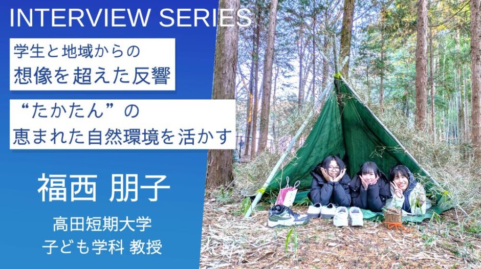 元々は音楽畑の出身でありながら、学科長(※当時)としてこの大胆な改革を牽引した福西朋子先生。専門外のゼロベースからどのように自然保育のフィールドを開拓し、コロナ禍という危機も乗り越えてきました。地域の専門家や行政も巻き込み、これからの保育者養成にかける熱い思いを伺いました。