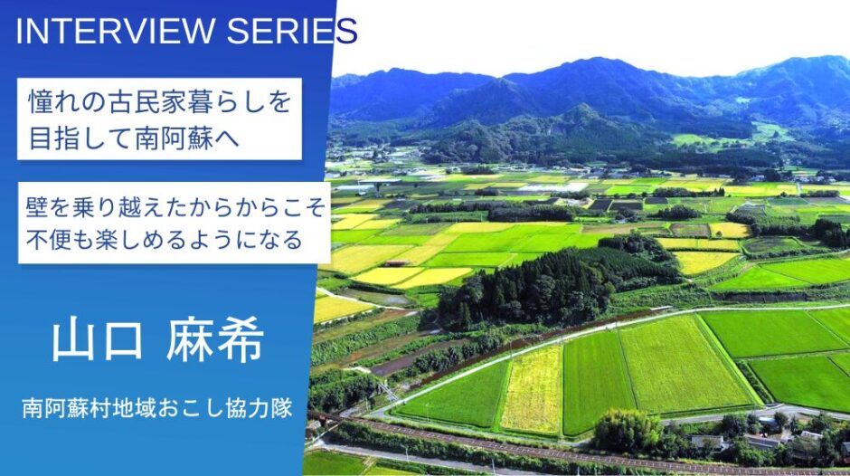 熊本県生まれ福岡市育ちの山口さんは、田舎暮らしに憧れ、ご夫婦で熊本県阿蘇郡南阿蘇村へ移住され、地域おこし協力隊に就任しました。阿蘇五岳を含む景観のすばらしさに惹かれて移住を決めたものの、住む家が決まるまでには何度も「心が折れた」そうです。今回は移住の際にぶち当たった壁のことや、ようやく手に入れた田舎暮らし、南阿蘇村の特徴や移住のヒントについて、お聞きしました。