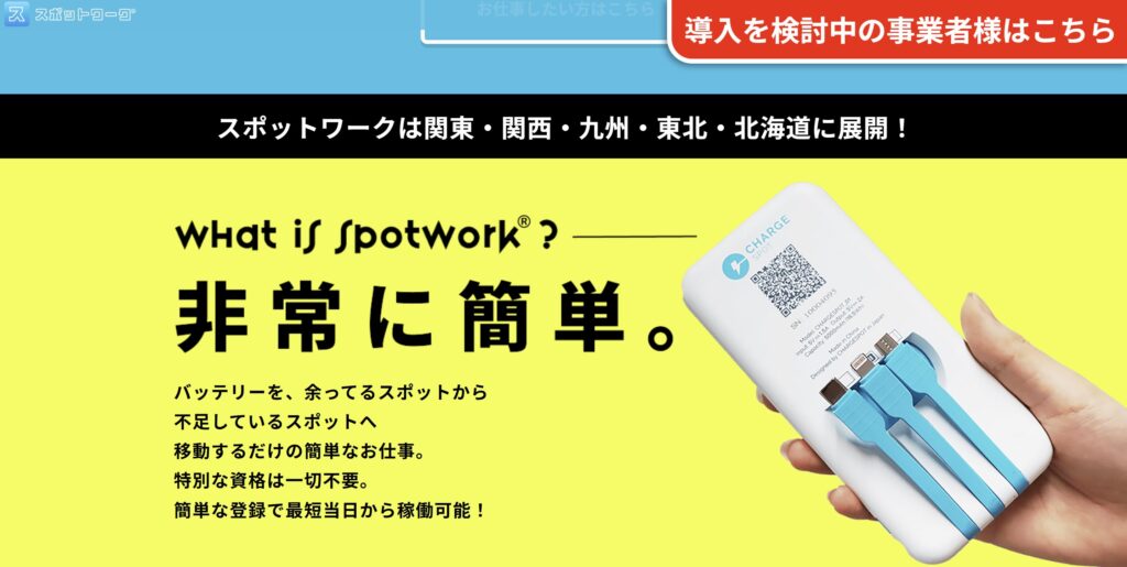 SpotWORK(スポットワーク)は、モバイルバッテリーシェアサービス「チャージスポット」の回収・設置作業を行う仕事です。